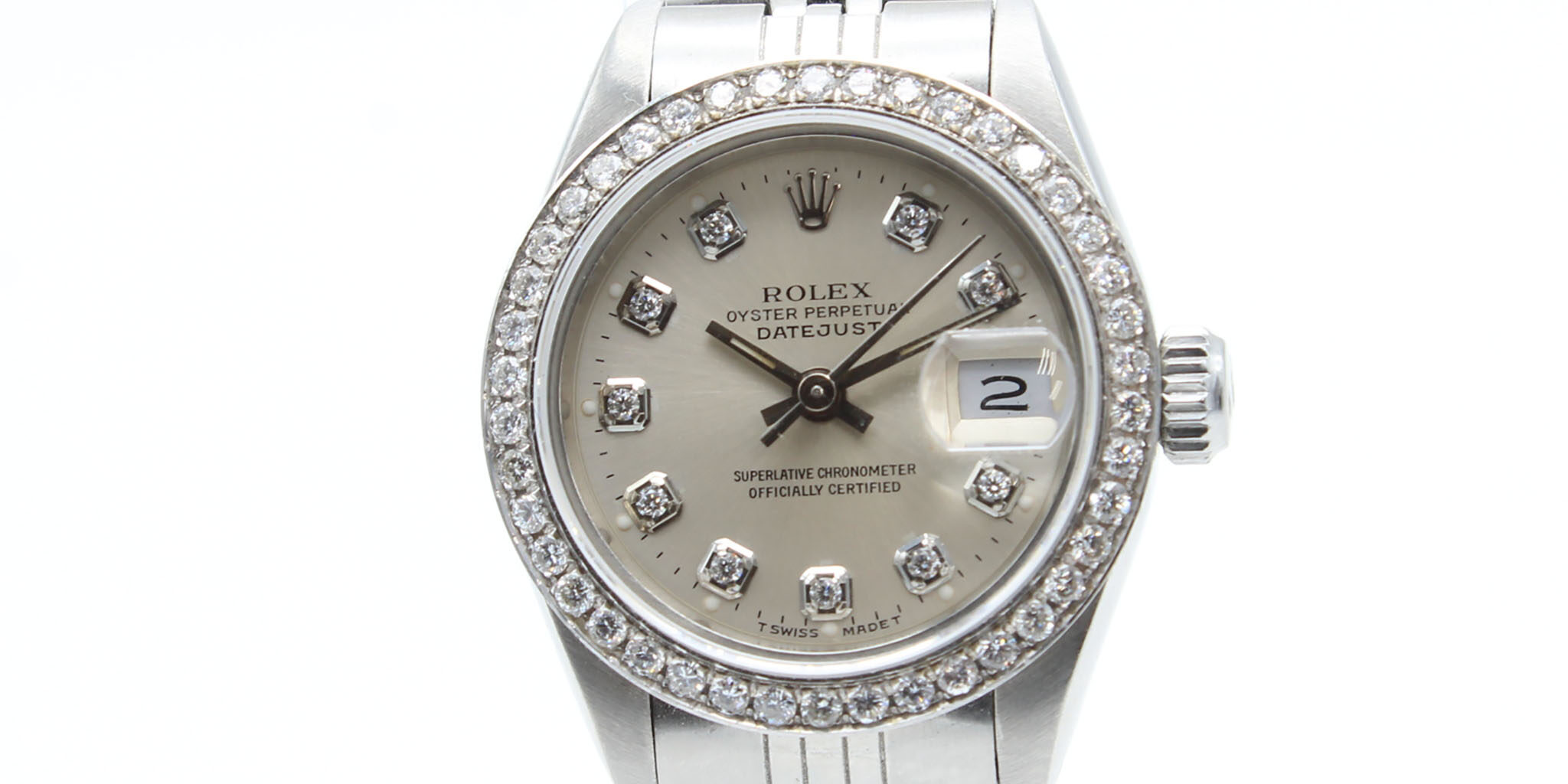 Case: 26mm stainless steel case, custom diamond bezel, screw-down crown, and sapphire crystal