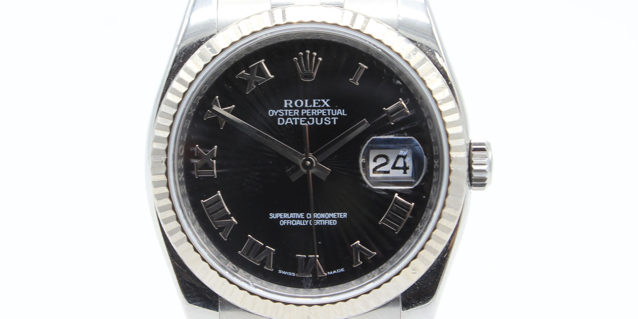 Case: 36mm stainless steel case, white gold fluted bezel, screw-down crown, and sapphire crystal