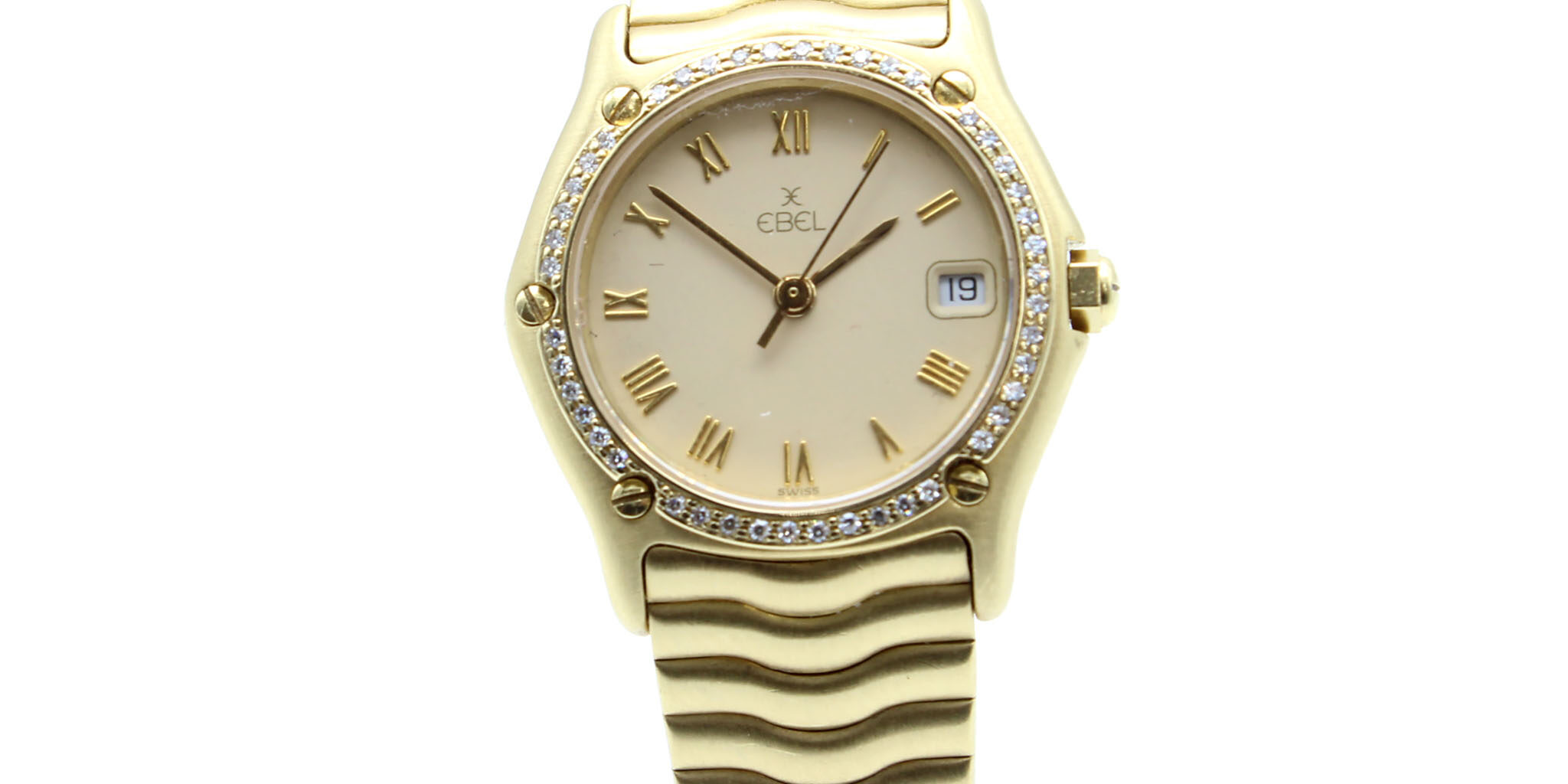 Case: 27mm 18ky gold, push-pull crown, diamond bezel and acrylic crystal