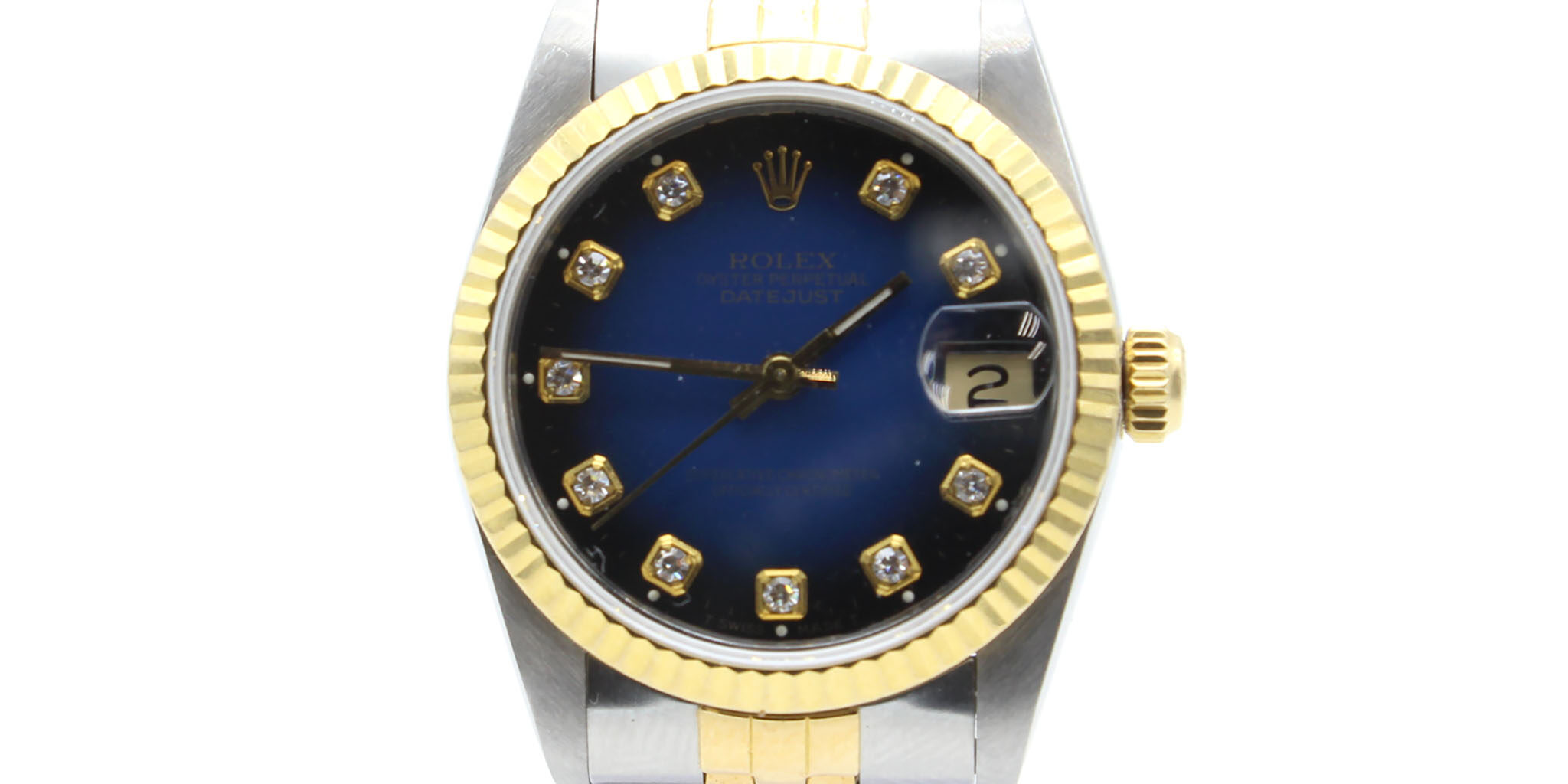 Dial: blue ombre dial, gold stick hands, and diamond markers
