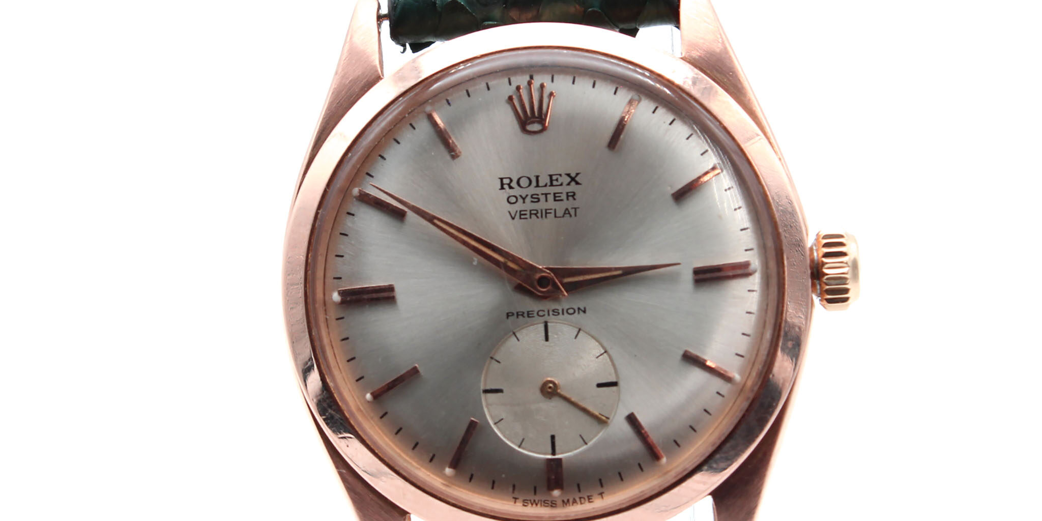 Case: 34mm rose gold case, screw-down crown, and acrylic crystal