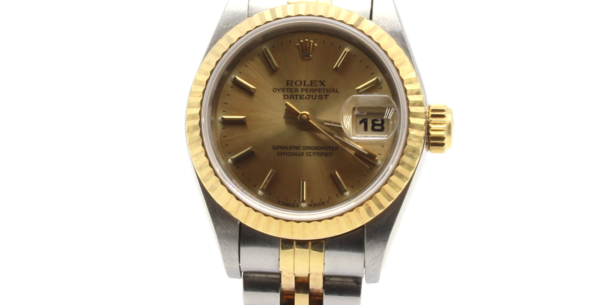 Case: 26mm stainless steel case, gold fluted bezel, screw-down crown, and sapphire crystal