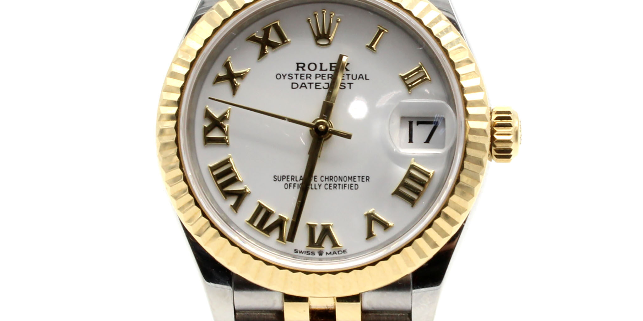 Case: 31mm stainless steel case, gold fluted bezel, screw-down crown, and sapphire crystal