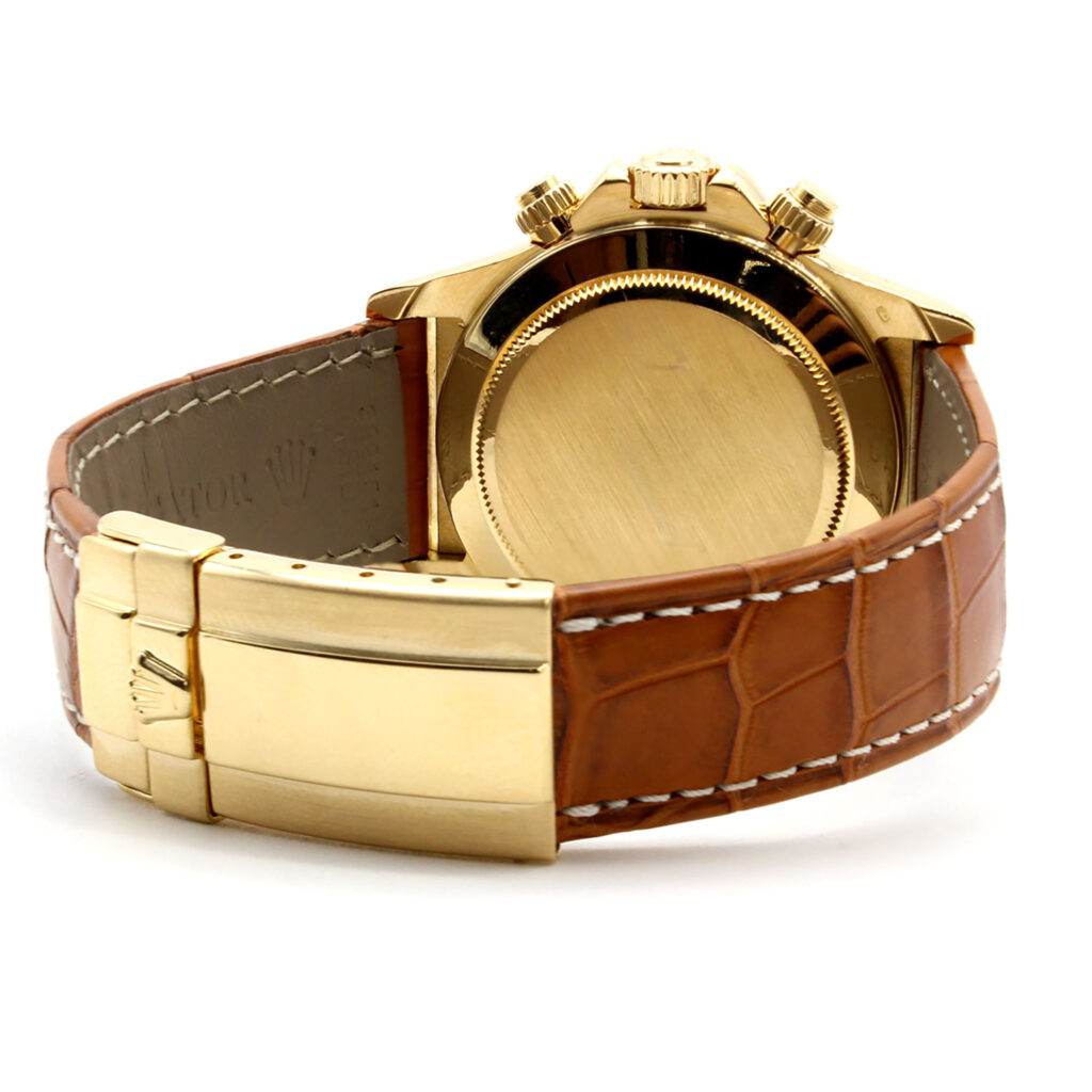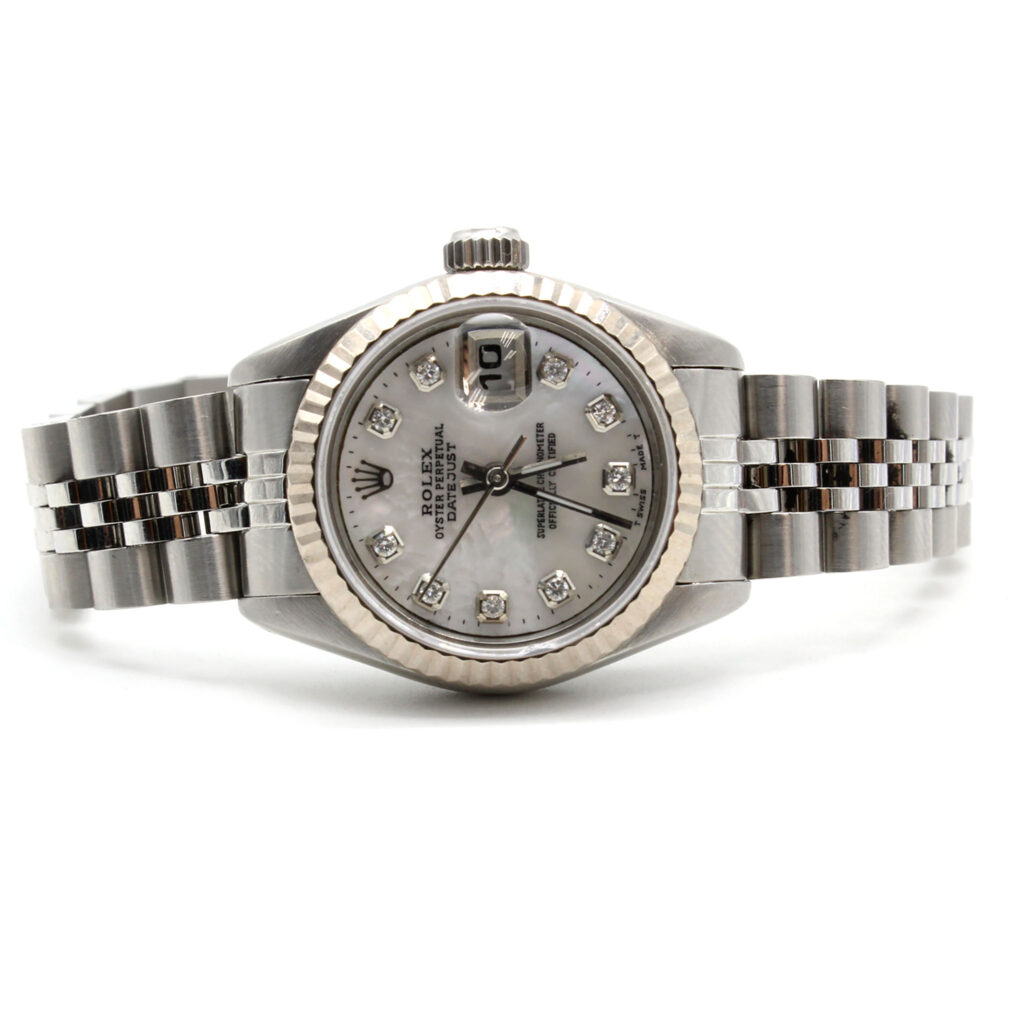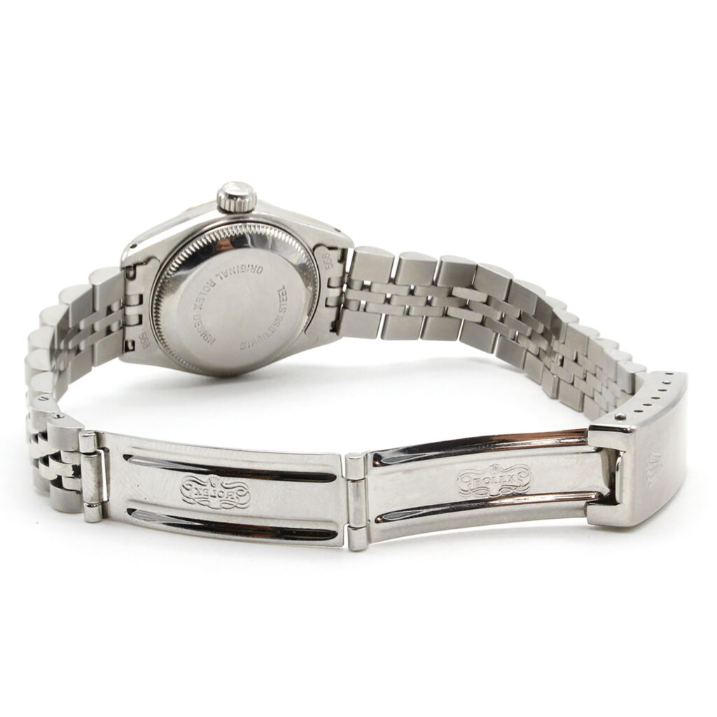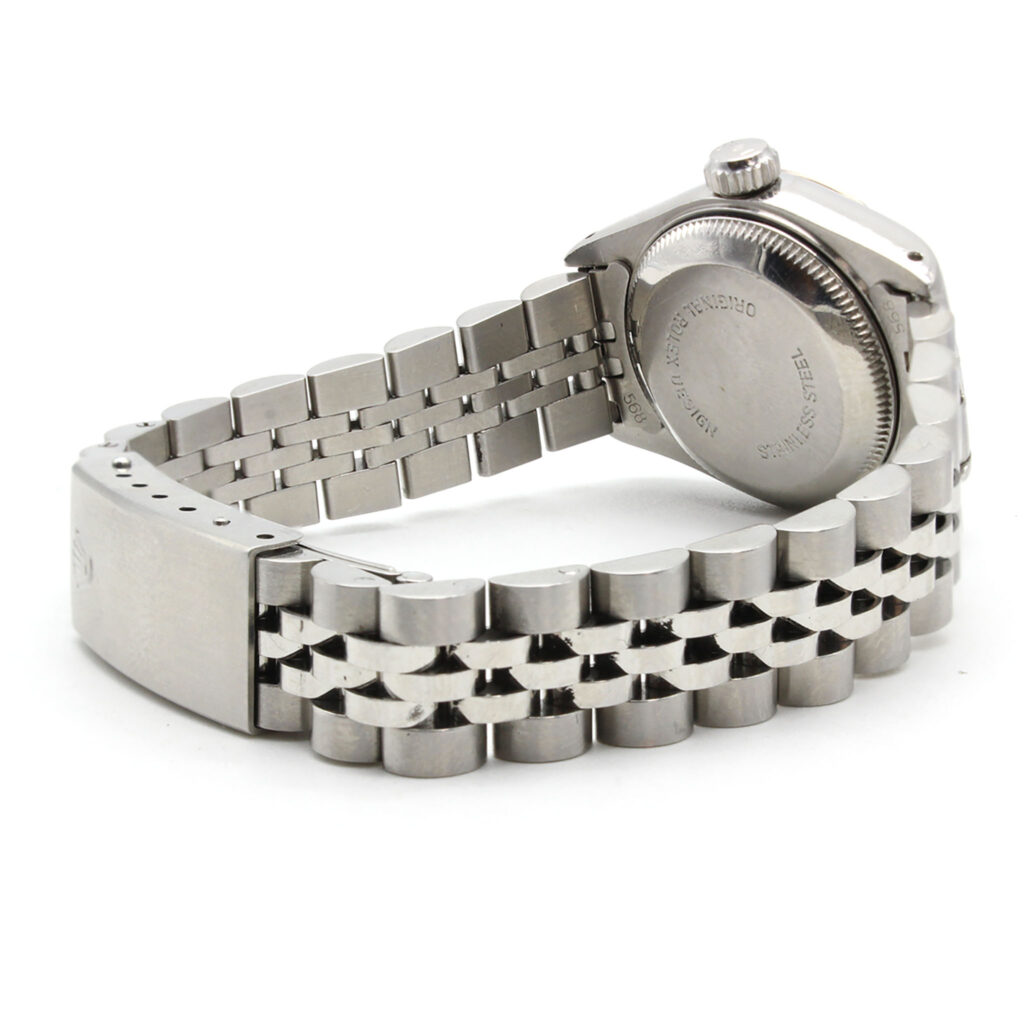 Case: 34mm stainless steel case, gold fluted bezel, screw-down crown, and acrylic crystal