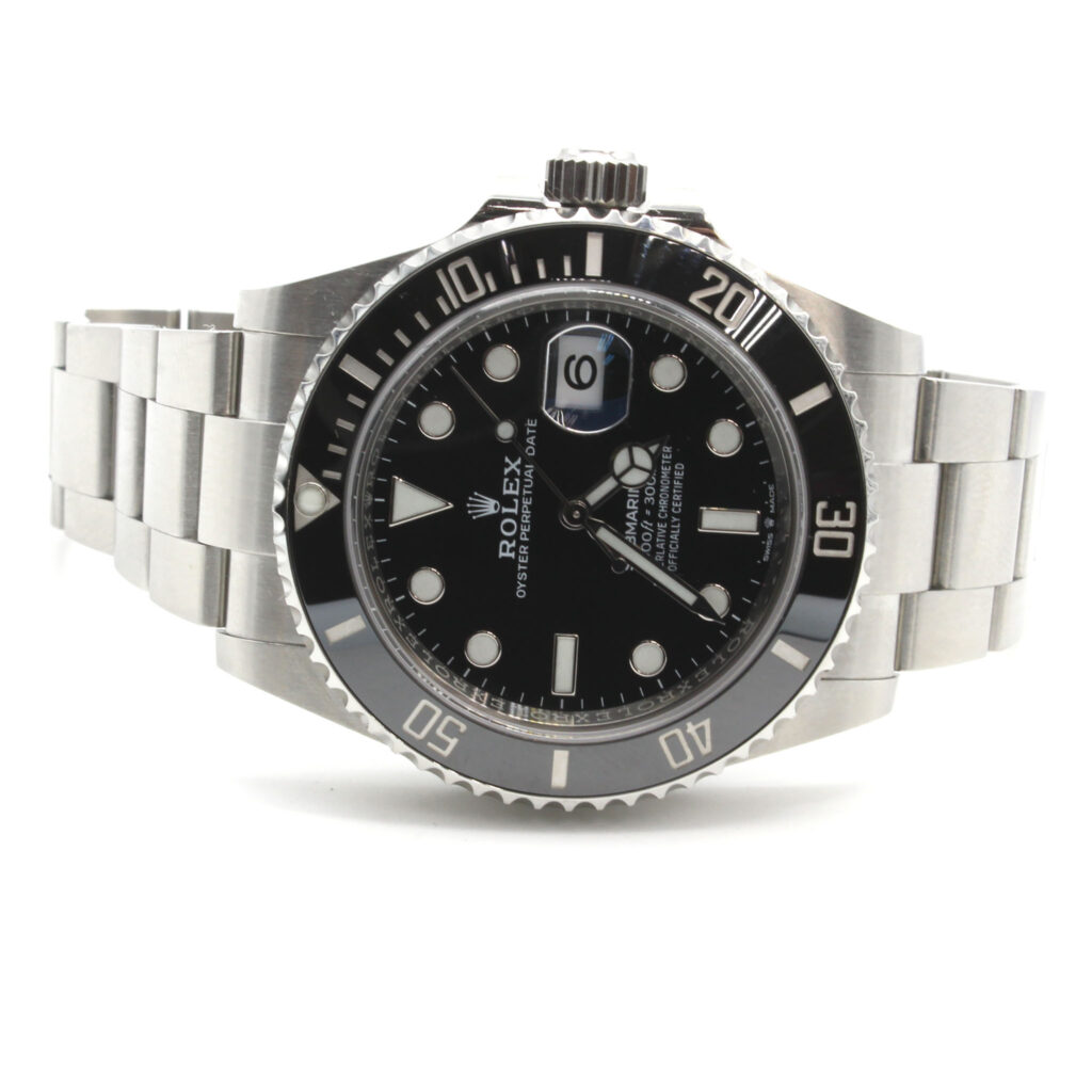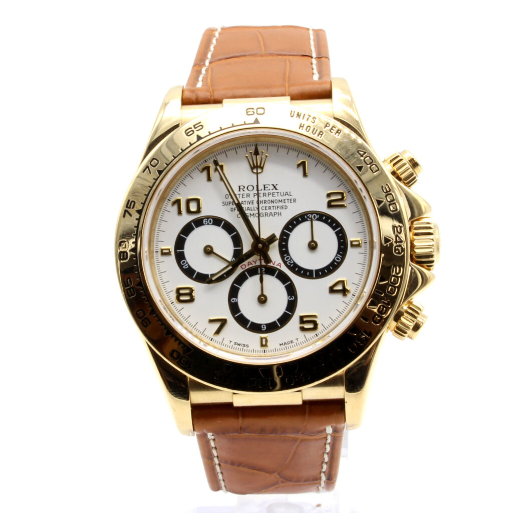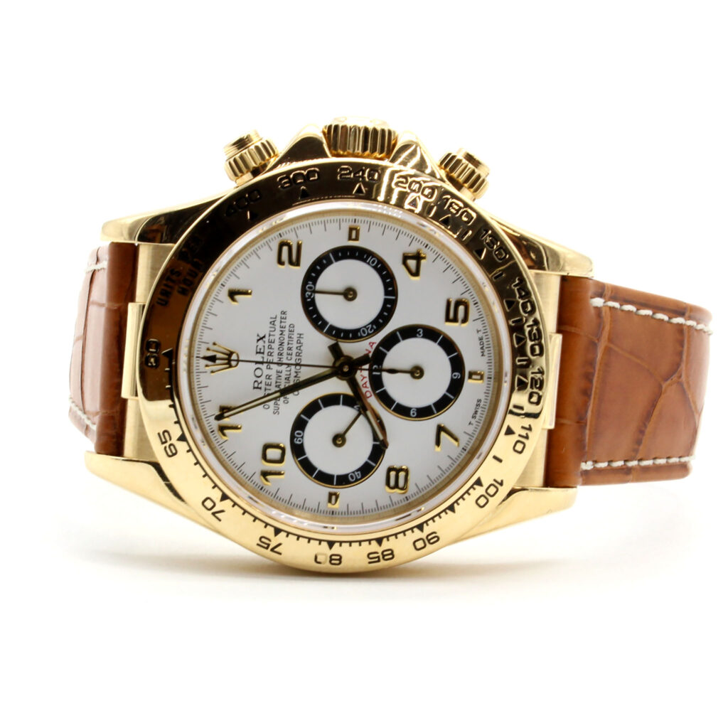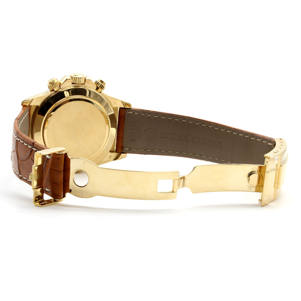 Case: 34mm stainless steel case, gold fluted bezel, screw-down crown, and acrylic crystal