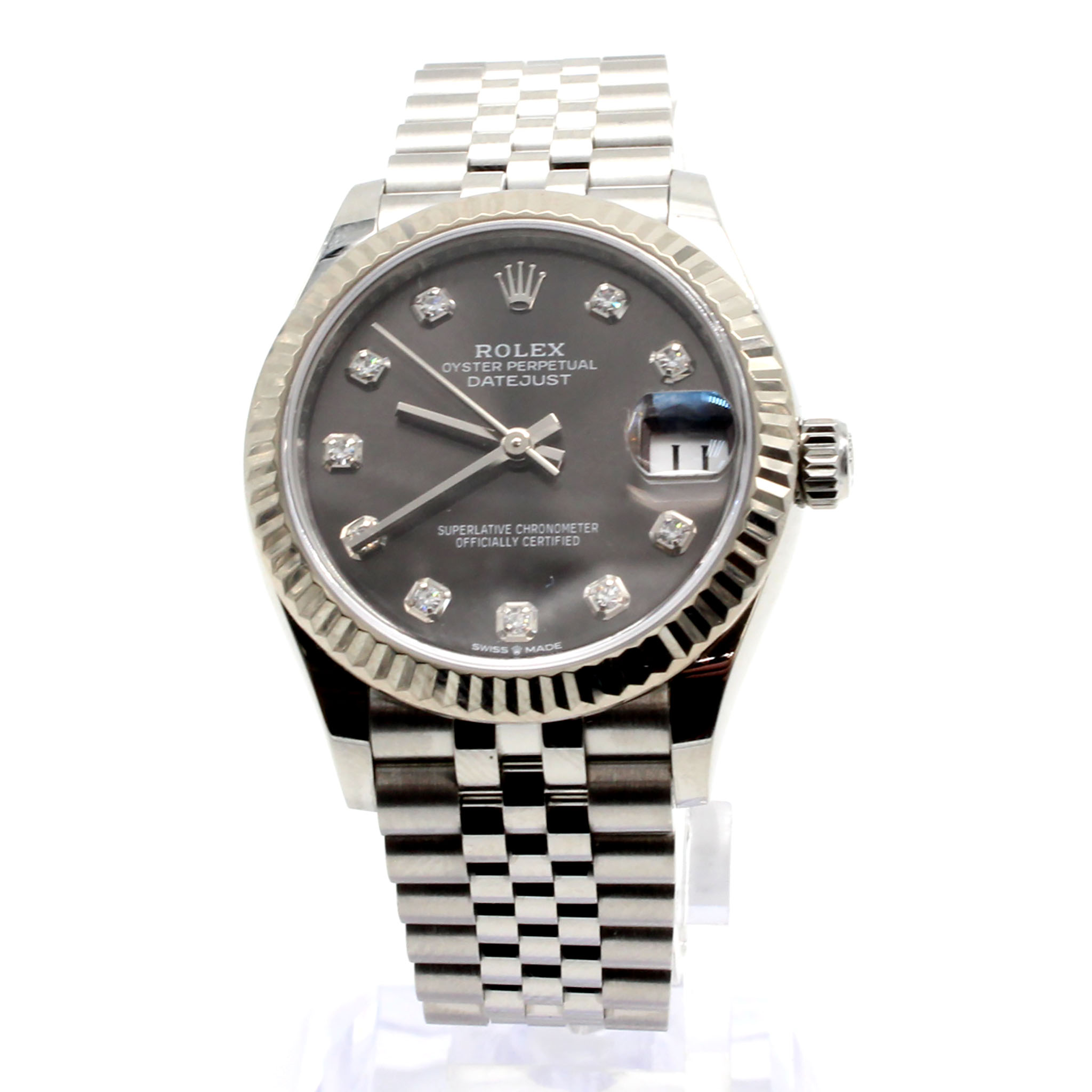 Case: 31mm stainless steel case, white gold fluted bezel, screw-down crown, and sapphire crystal