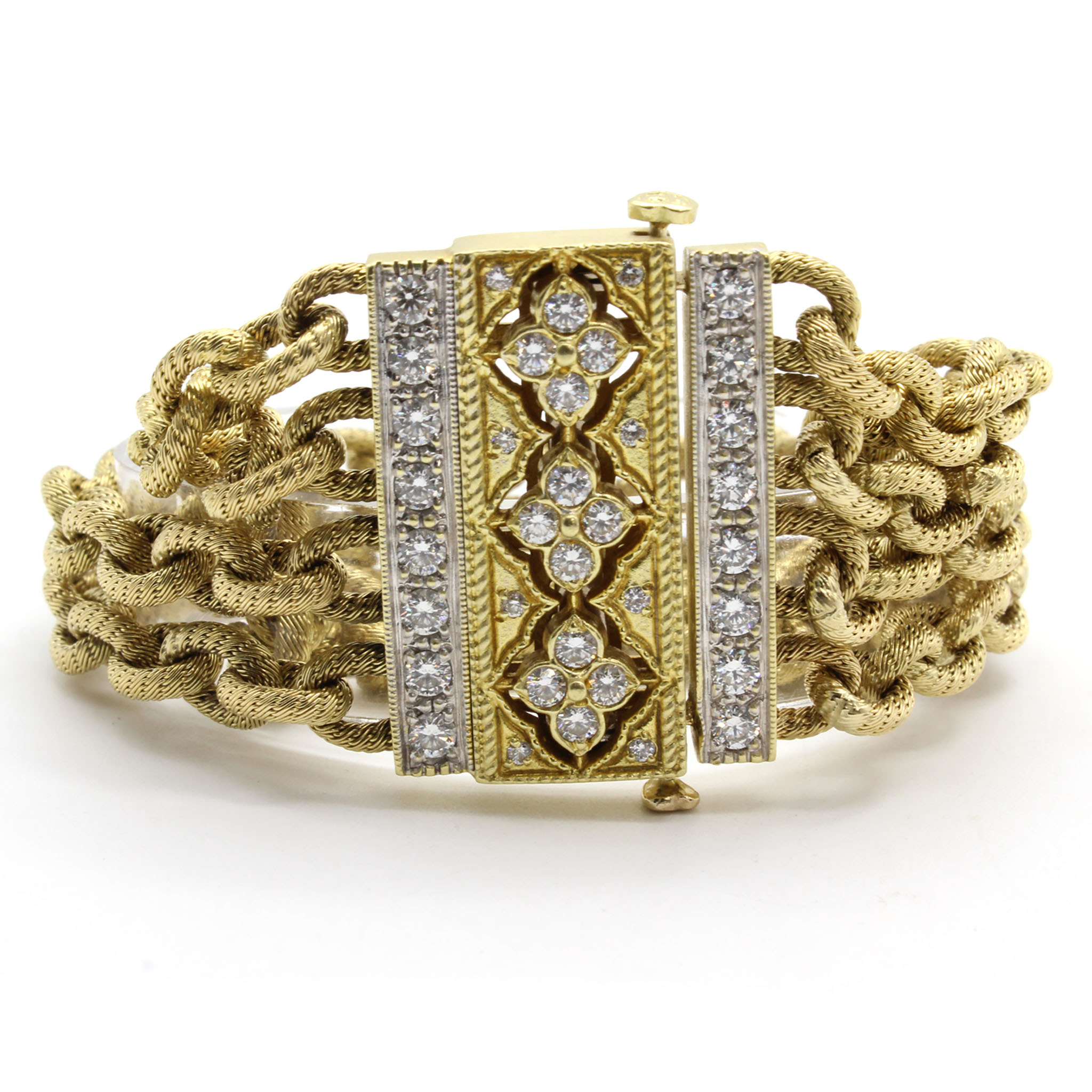 Case: 31mm stainless steel case, white gold custom diamond bezel, screw-down crown, and sapphire crystal